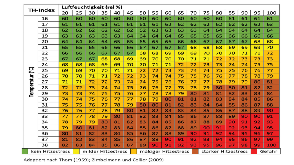 Hitzestress ist eine Kombination aus hoher Luftfeuchtigkeit und warmen Temperaturen. Kälber können bereits bei einer Temperatur von 25 Grad Celsius und einer Luftfeuchtigkeit von 50% unter Hitzestress leiden. Daraufhin steigt der THI (Temperature Humidity Index) über 68. Der THI ist eine Kombination aus Temperatur und Feuchtigkeit, wobei die Feuchtigkeit den größten Anteil am THI hat (Deck Salver Holder, 2019).